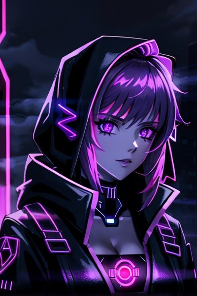 modern cyber witch with glowing runes, neon orange and purple lighting, halloween city