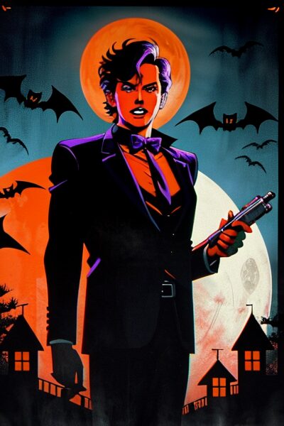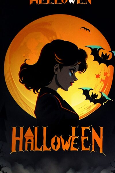retro horror movie poster style, halloween night, 1980s aesthetic