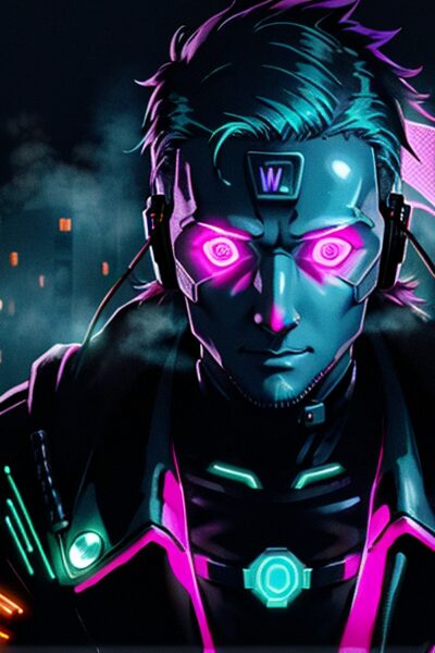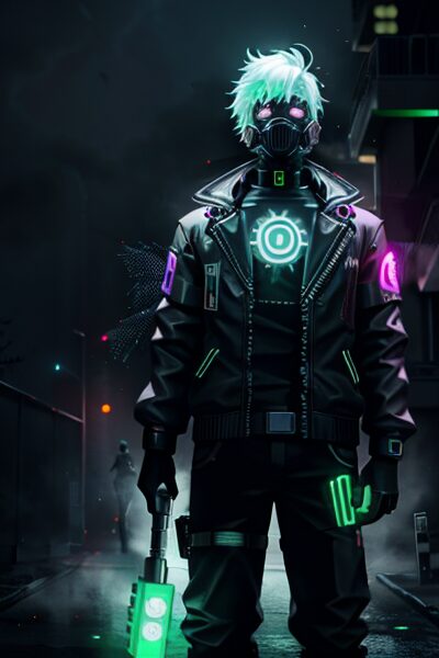 cyberpunk ghost with glowing digital particles, halloween neon night