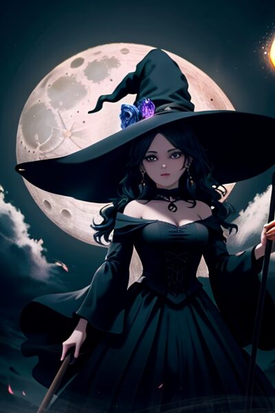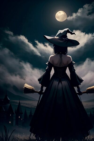 best quality, masterpiece, beautiful witch in a black dress, holding a broom, glowing moon behind, cinematic lighting
