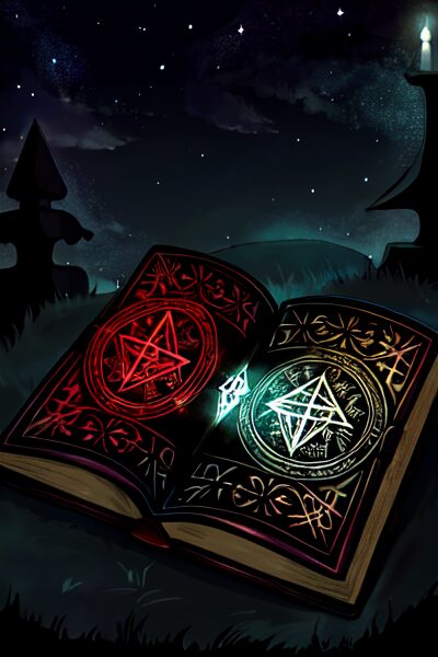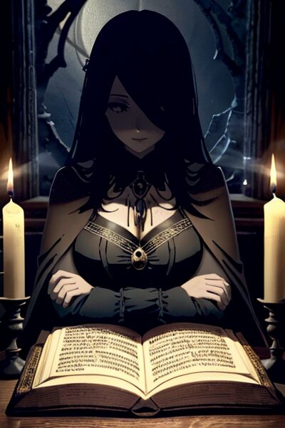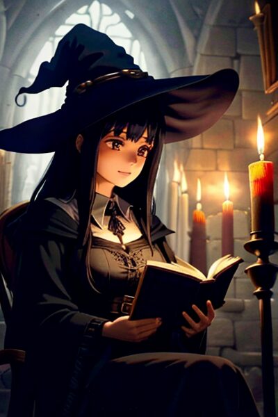 dark academia witch reading ancient book, candlelight and gothic decor,
