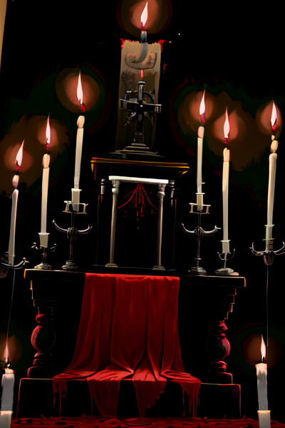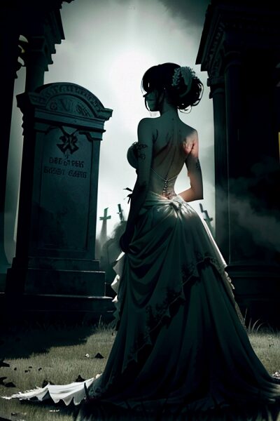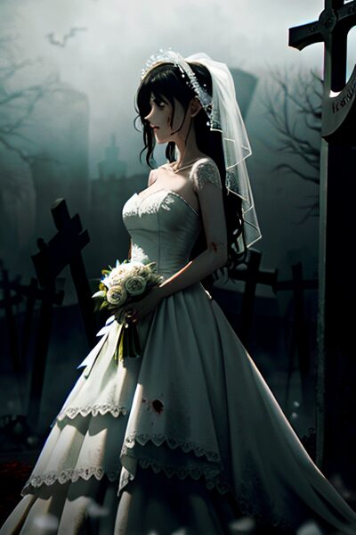 「愛と恐怖」をテーマにした幻想的構図。白ドレス×血のコントラストが印象的。