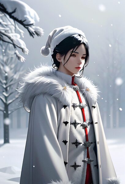 snow-white santa outfit, white fur coat, silver accents, cool winter lighting, falling snow, serene mood, cinematic look, winter fantasy,