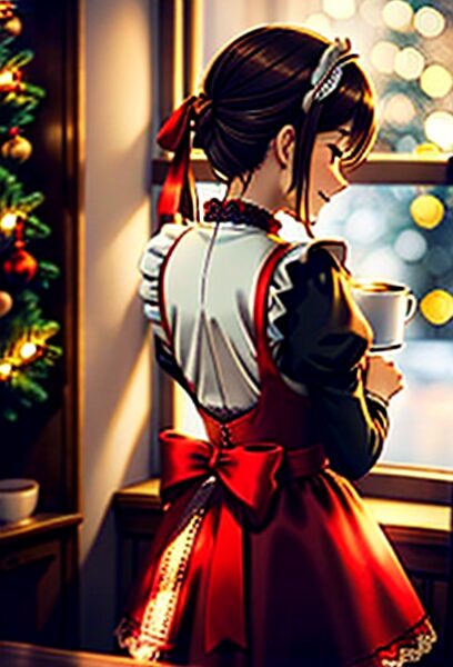 christmas maid outfit, red apron dress, lace trim, soft bokeh lights, holiday cafe vibe, charming smile, warm tones,