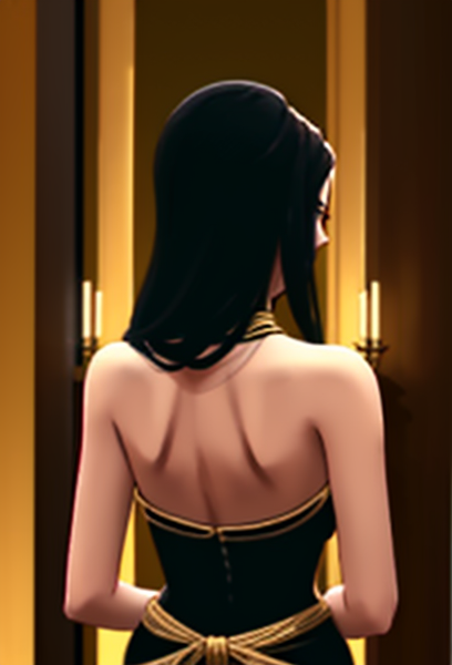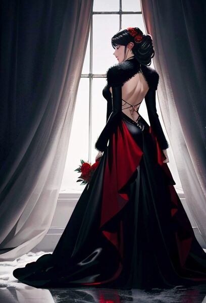 high fashion christmas woman, black satin dress, silver accessories, deep red roses, dramatic spotlight, luxury winter aesthetic, magazine style portrait, back view