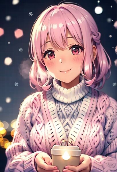 soft pastel christmas girl, muted tones, fluffy knit cardigan, pink x white color palette, gentle smile, bokeh fairy lights background, cinematic soft lighting, high resolution, cozy winter mood,