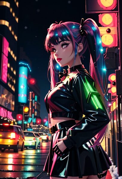 y2k cyber santa girl, glossy lipstick, metallic skirt, twin tails, neon christmas lights, vivid color palette, street night snap style, fashion photography, model pose