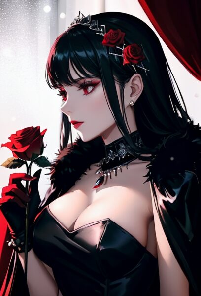 high fashion christmas woman, black satin dress, silver accessories, deep red roses, dramatic spotlight, luxury winter aesthetic, magazine style portrait, model pose