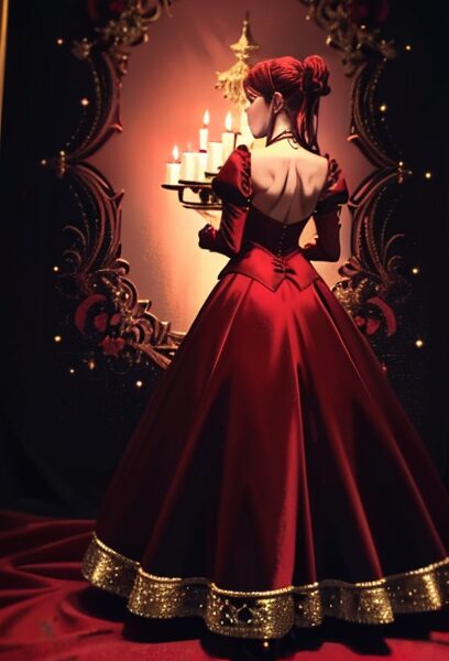 ruby red velvet dress christmas girl, elegant pose, jewel tone palette, luxurious mood, golden candlelight, premium portrait look, back view
