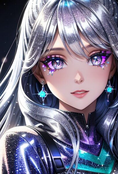 winter glitter makeup festival girl, silver sparkle eyes, hologram accessories, cold color tones, energetic expression, live event lights, model pose