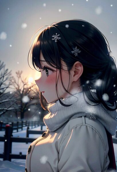 romantic side-profile winter girl, faint blush on cheeks, snowfall in backlight, quiet love atmosphere, Japanese drama cinematography