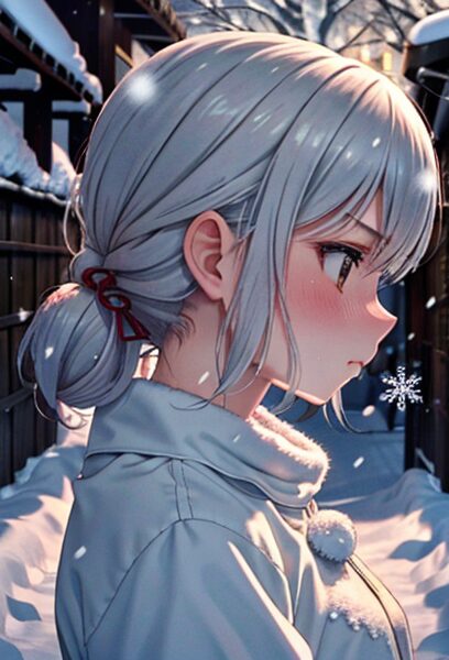 romantic side-profile winter girl, faint blush on cheeks, snowfall in backlight, quiet love atmosphere, Japanese drama cinematography, angrily pouting face