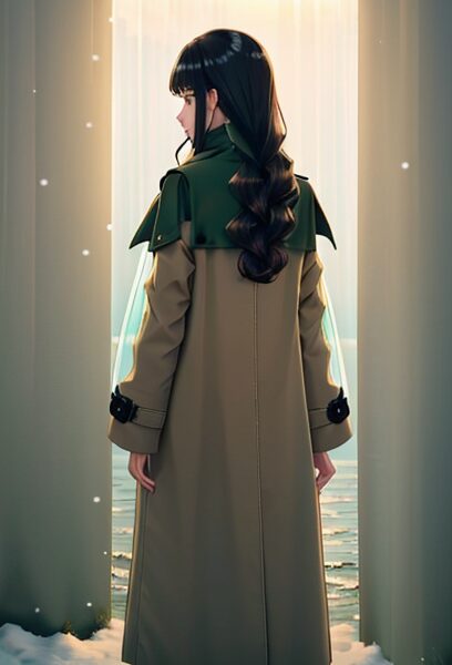 k-fashion 2025 long coat winter girl, glossy wave hair, muted green or beige palette, natural soft skin tone, bright backlight, transparent winter aesthetic, back view